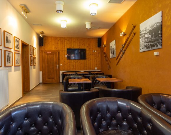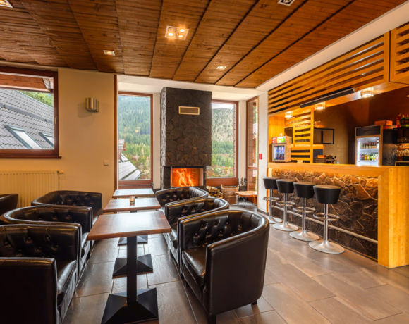 Uvoľnená atmosféra, praskajúci oheň a pohár obľúbeného nápoja - bar s krbom je miestom, kde sa deň končí v príjemnej spoločnosti. Ideálne posedenie pre firemné akcie. Bar je spojený priamo s kongresovou miestnosťou.