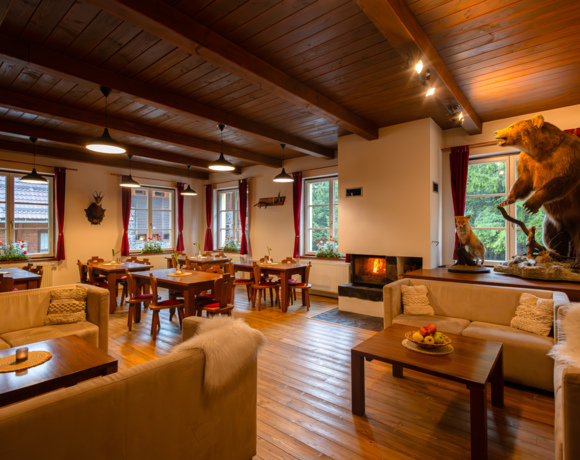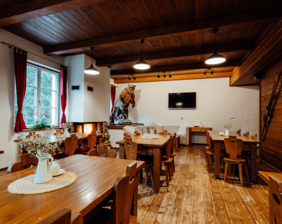 Salónik s dreveným interiérom, krbom a ikonickým medveďom vytvára jedinečnú atmosféru na každé stretnutie. Je ideálnym priestorom pre rodinné oslavy, priateľské posedenia, či firemné meetingy v komornejšom prostredí. Kapacita do 30 osôb ponúka dostatok pohodlia a súkromia priamo v srdci Jasnej.